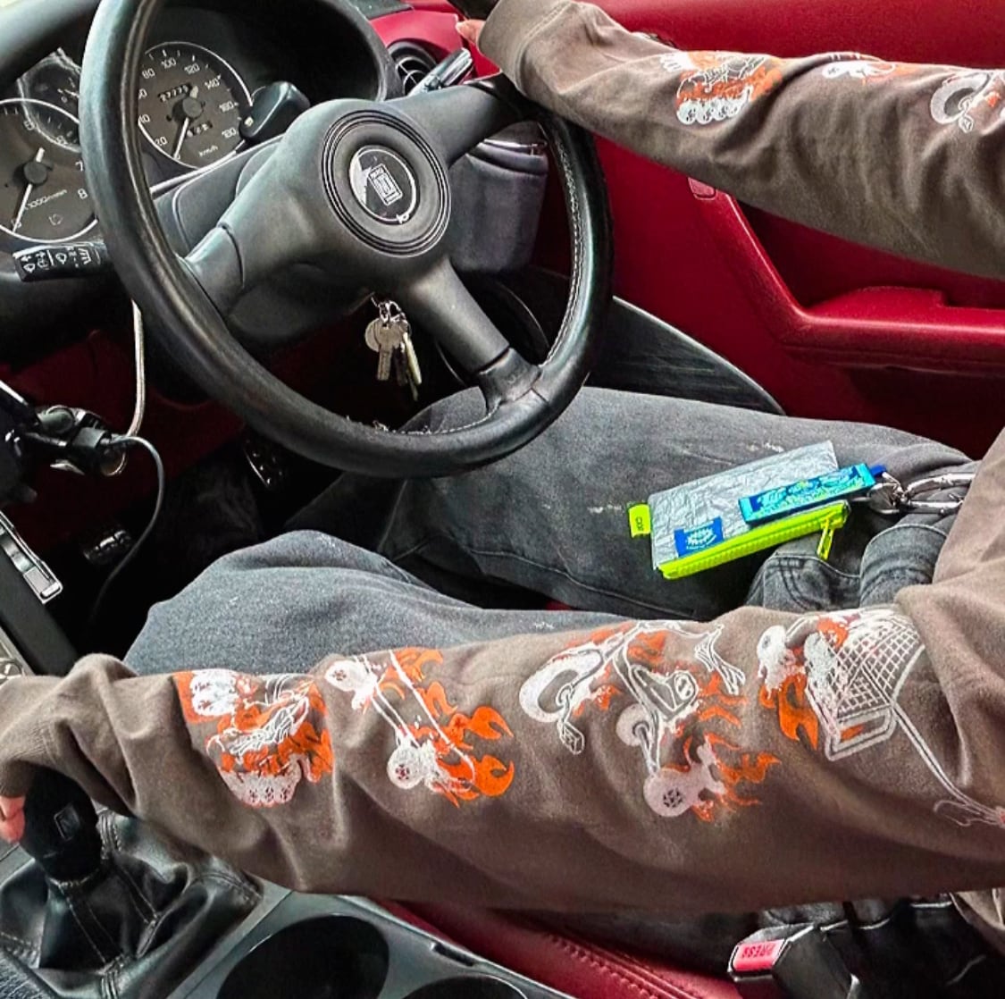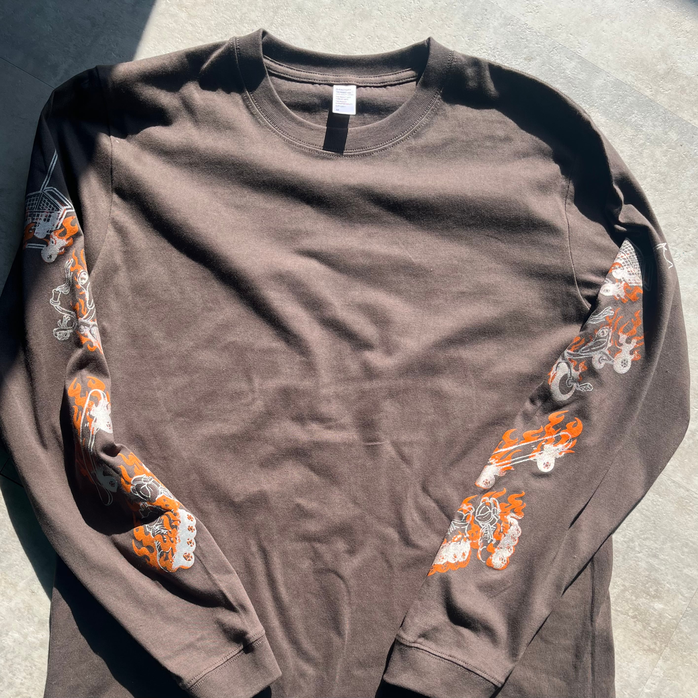 チャコールのボディにパキッとオレンジ×メタリックな質感のシルバーの組み合わせに手刷りシルクスクリーンならではの擦り具合でビンテージ感あふれる大人の遊び心を演出しました!